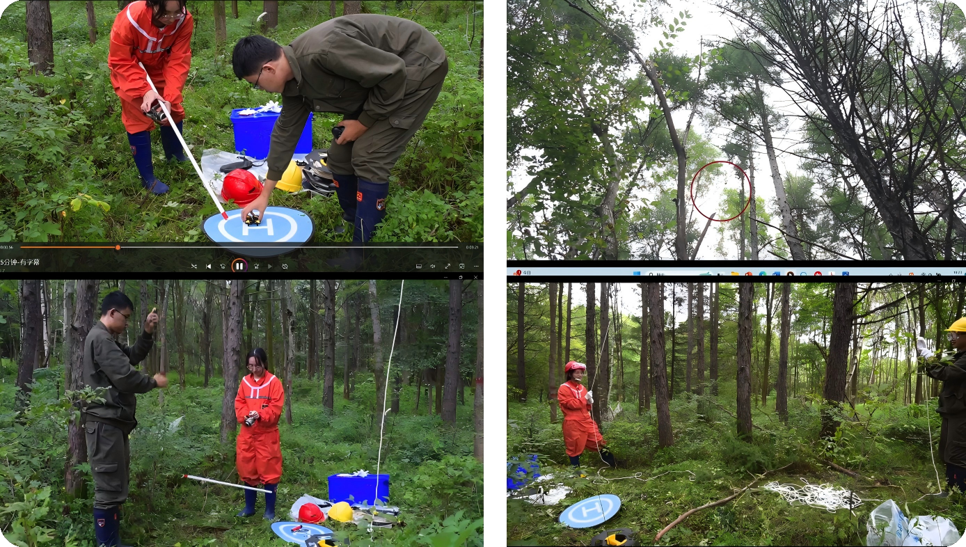 树冠样品的采集一直是林业科研和管理者面临的严峻挑战。传统方法包括人工爬树、高枝剪、抛绳器、液压升降设备等,但这些方法往往受到安全隐患、高度限制、回收精度低、设备成本高等因素的制约。为此,本项目研发了一种智能微型无人机树冠样品采集系统。该系统通过操控微型无人机,将牵引线跨越目标枝条,牵引回收绳至所选枝条切割点,并携带金属线锯或链锯完成树冠样品的切割。智能无人机可自动避障,提高取样成功率,野外取样证实在人工林和原始林表现俱佳,具有广阔的应用潜力。采用该系统,研究人员能够安全、高效、低成本地获取树冠样品,可为深入开展枝条、叶片和种子功能性状相关的生理生态学研究提供技术支撑,助力科技兴林战略实施。