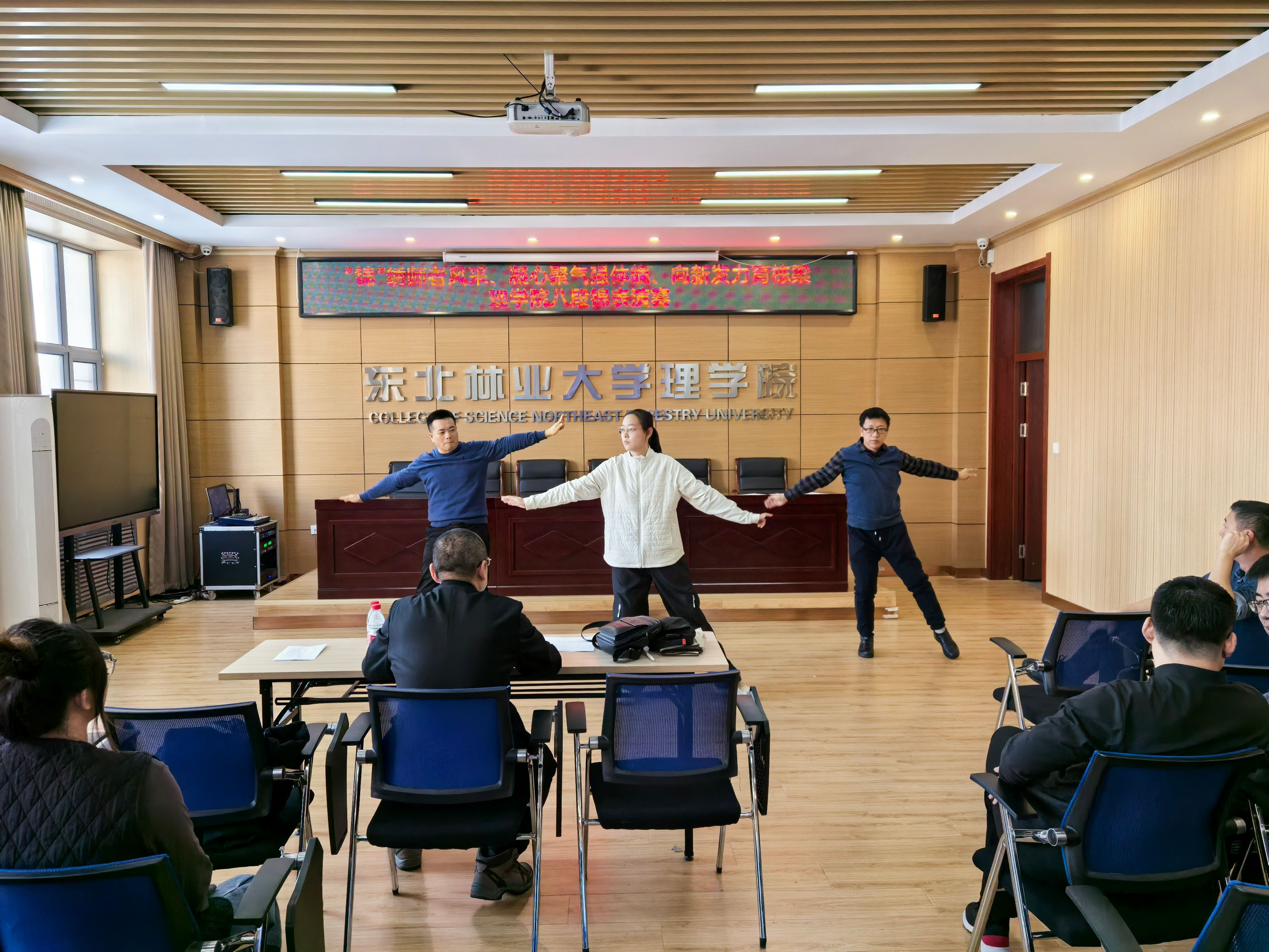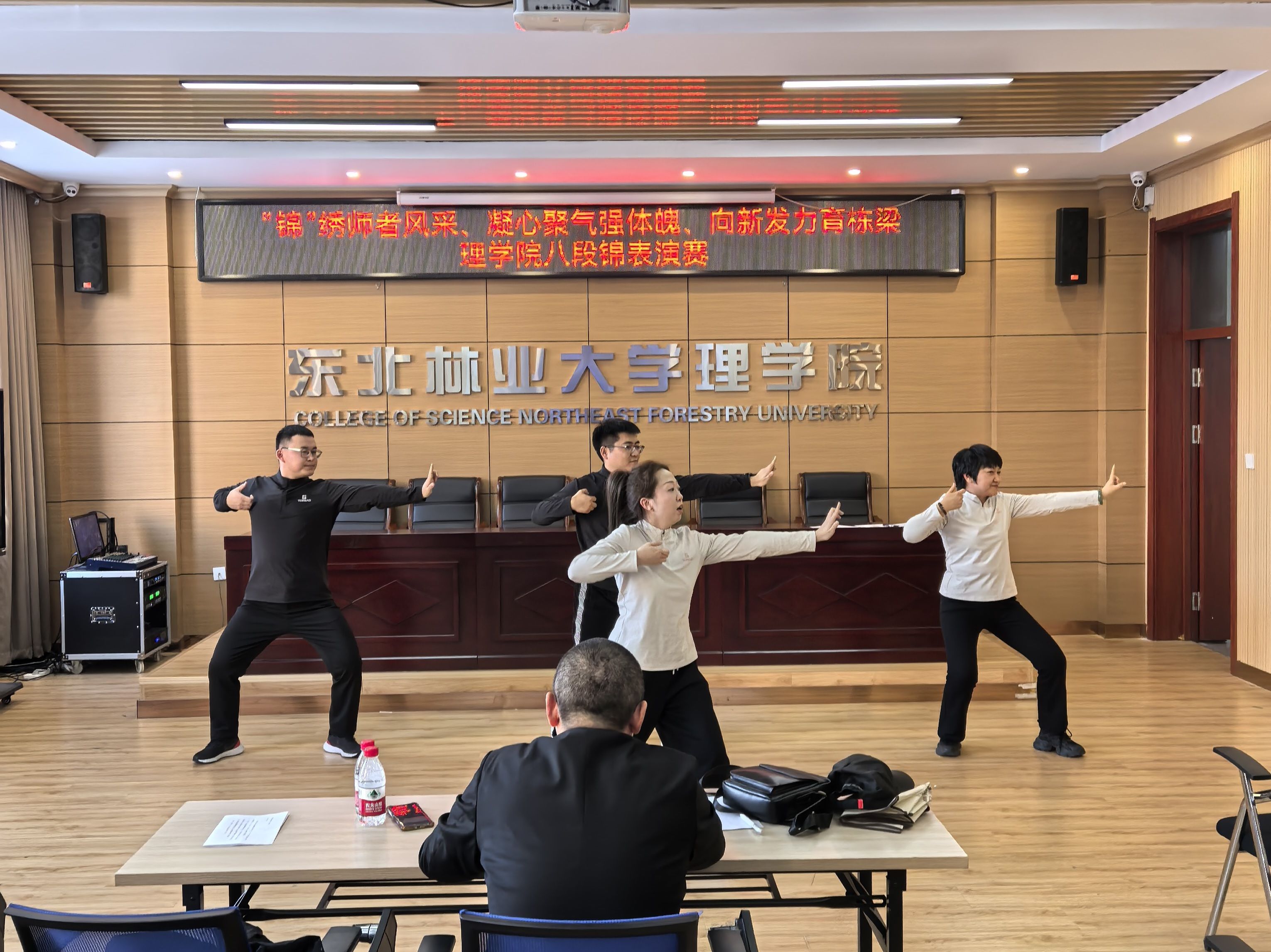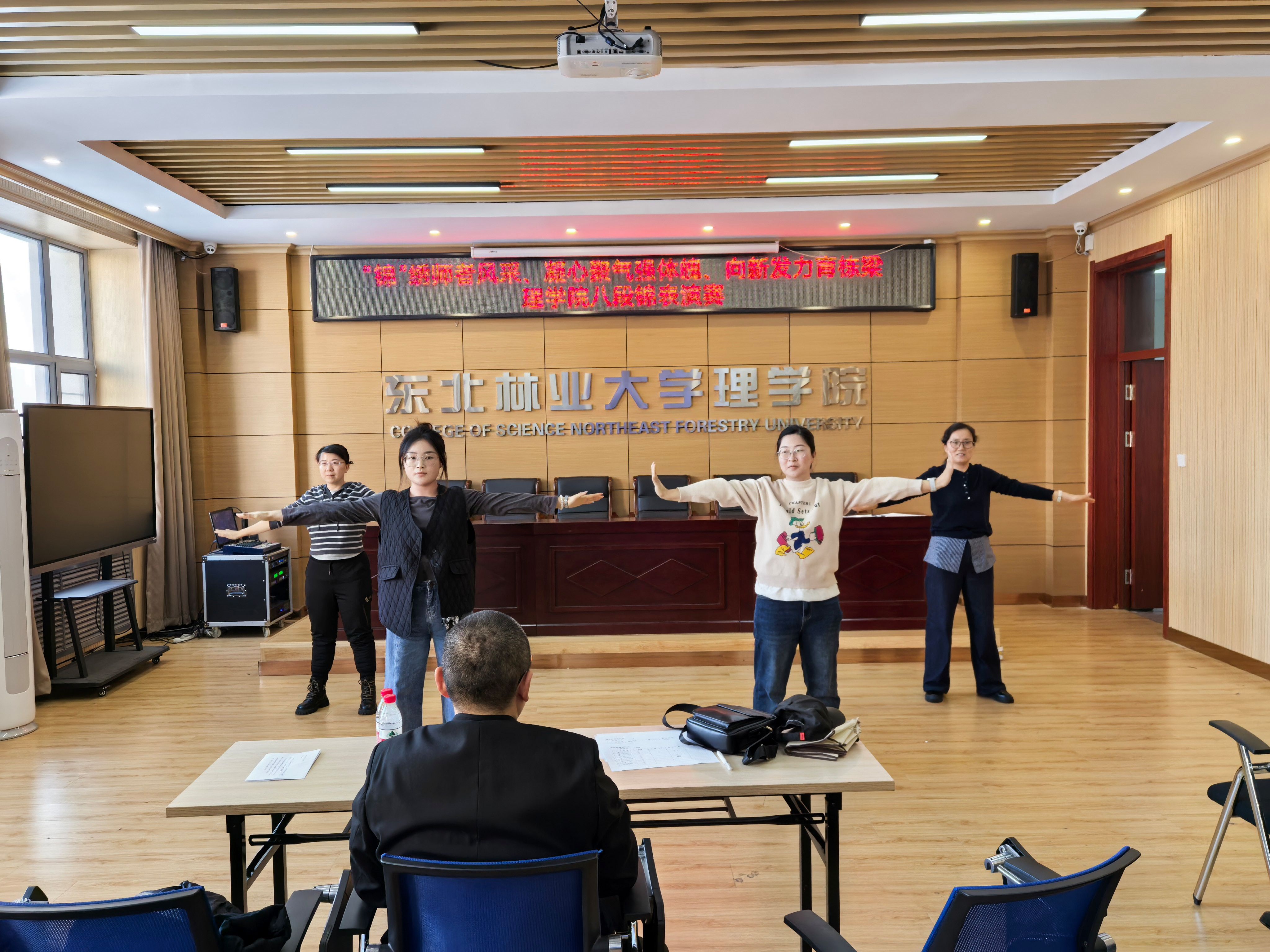 为弘扬中华优秀传统文化,倡导健康生活理念,提升教职工身体素质与团队凝聚力,12月24日下午,理学院工会在锦绣楼举办了以“锦绣师者风采、凝心聚气强体魄、向新发力育栋梁”为主题的教职工八段锦表演赛。体育部教师张晓龙担任评委。